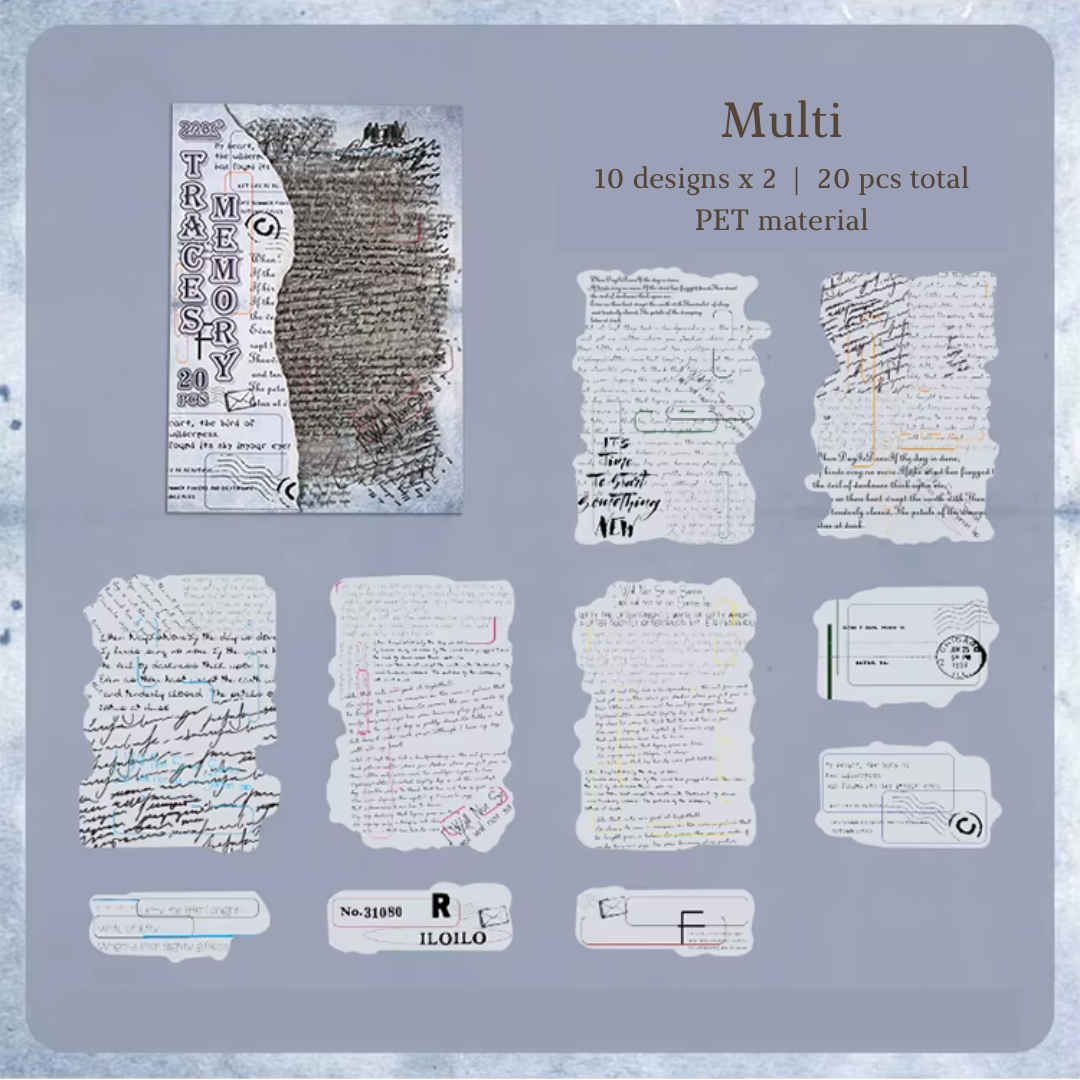 Add a nostalgic charm to your pages with this set of 20 Vintage Text Fragment Stickers. Each piece features beautifully aged typography, classic print textures and softly faded tones inspired by old letters, coffee stains and documents.